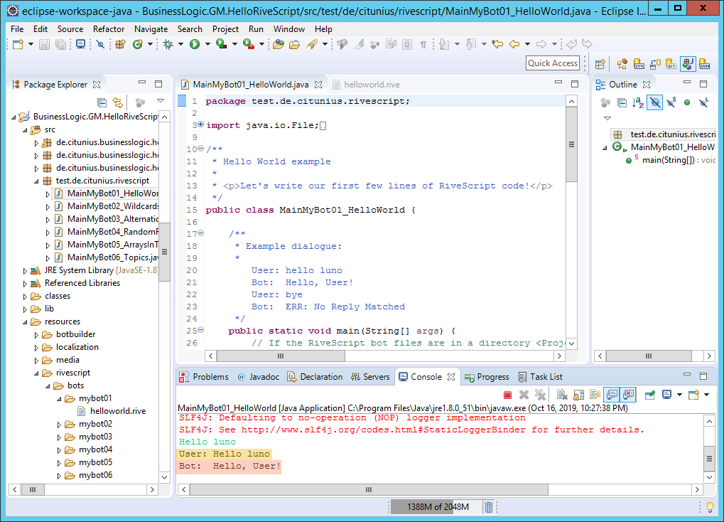 The best way to start is with the examples from the Java project, which you can download here (BusinessLogic.GM.HelloRiveScript.v1.zip / ~10 MB). Now import the Java project into the Eclipse development environment and execute the program example “MainMyBot01_HelloWorld.java“. You can now start the dialog and extend it step by step.