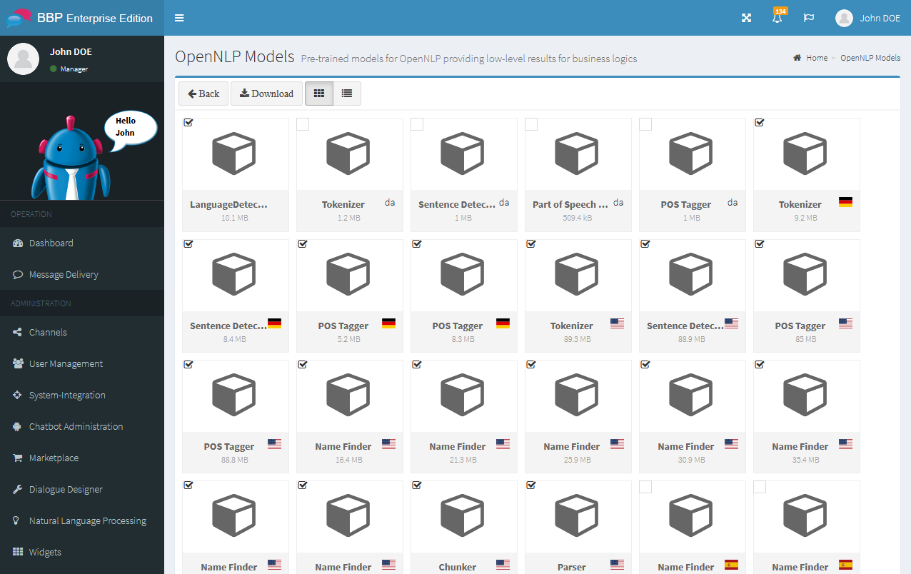 The Business Bot Platform uses the power of OpenNLP and simplifies the use of pre-built and custom NLP models. With release R2020 FP2040, NLP models can be downloaded or added with few mouse clicks. The NLP models are immediately ready for use and can be used by any chatbots on the platform for word processing.