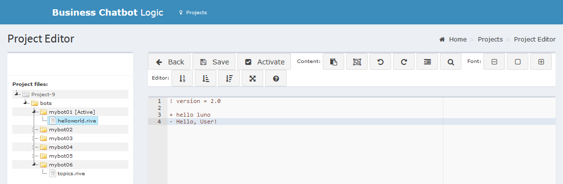 Der integrierte Editor hilft Ihnen beim Scripten der Dialoge mit RiveScript oder AIML 2.0 durch Syntax-Highlighting und Fehlererkennung. Zudem können Sie die Dialoge direkt in der Chat-Konsole ausprobieren, um die Fähigkeiten des Chatbots zu erweitern.