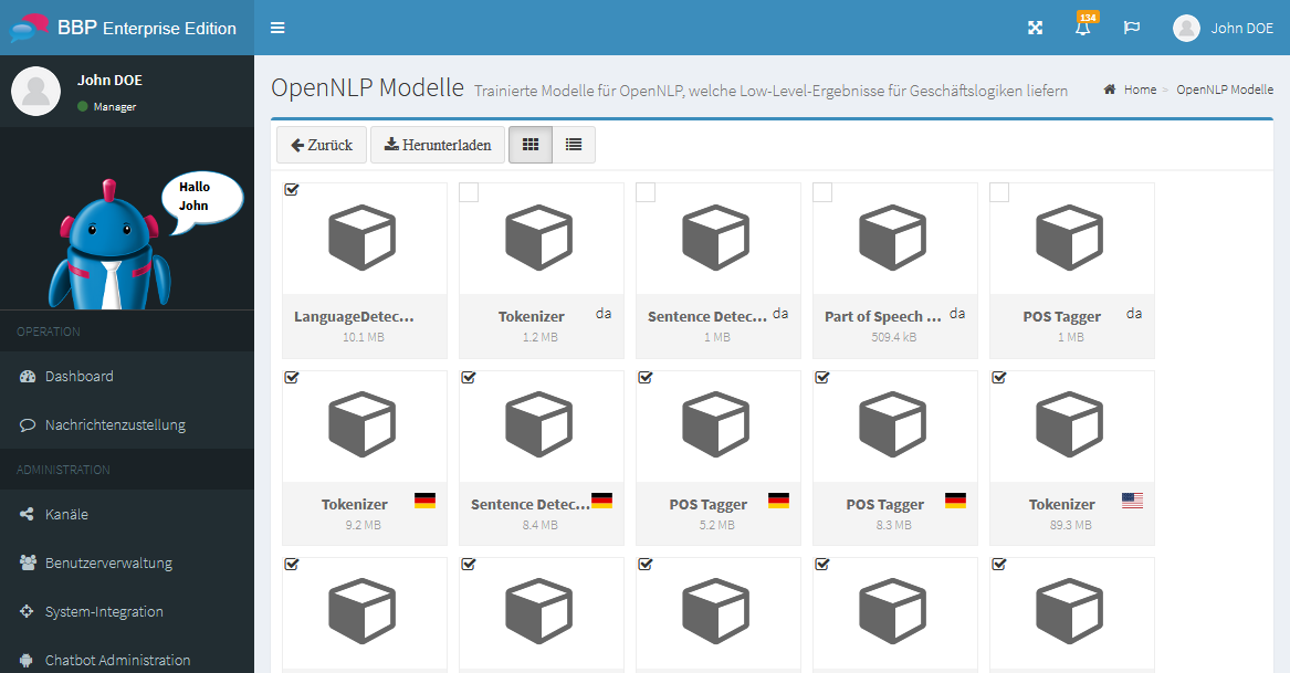 Die Business Bot Plattform nutzt die Leistung von OpenNLP und erleichtert die Nutzung von vorgefertigten und benutzerdefinierten NLP-Modellen. Mit Release R2020 FP2040 können NLP-Modelle ganz einfach mit einen Klick heruntergeladen bzw. hinzugefügt werden. Die NLP-Modelle sind sofort einsatzbereit und können von allen Chatbots auf der Plattform für die Textverarbeitung genutzt werden.